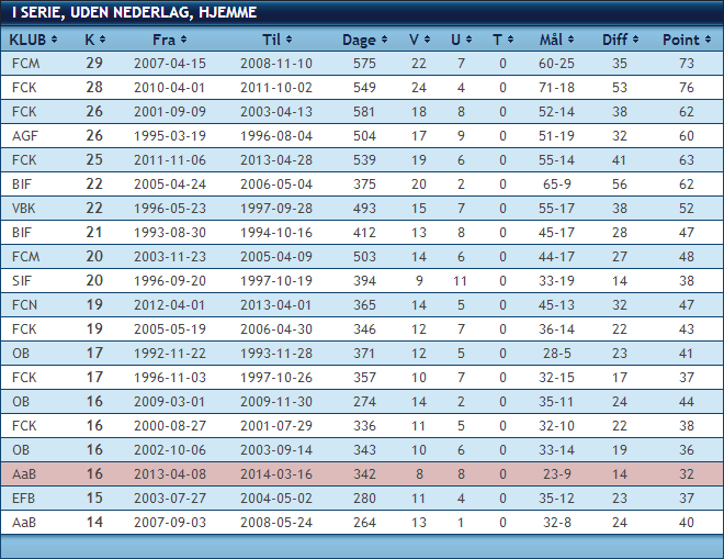 Dermed er det en noget hård statistik, Kent Nielsen er oppe mod. Til gengæld har hans tropper været godt kørende på hjemmebanen. I de seneste 16 kampe er kluben ubesejret, og AaB forbedrer sin klubrekord hver gang de forlader Nordjyske Arena uden nederlag.