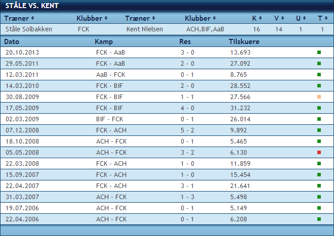Samlet hedder Ståle Solbakkens trænerstatistik mod AaB 17 kampe (10V-3U-4T), mens den for Kent Nielsen mod FCK hedder 26 kampe (2V-3U-21T)